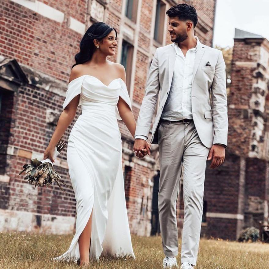 Country Side Split Sheath Wedding Dresses Pock Ups Off Shoulder Bridal Gowns