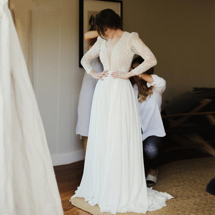 Elegant Bohemian Graden Wedding Dresses Lace Long Sleeve Bridal Gowns Deep V Neck Chiffon Floor Length Boho vestido