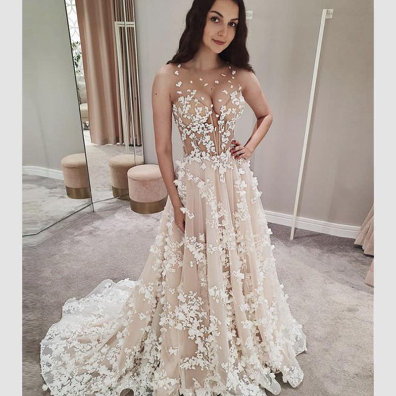 Champagne Lace Wedding Dresses Formal A Line Boho Backless Illusion Bodice Bridal Gowns
