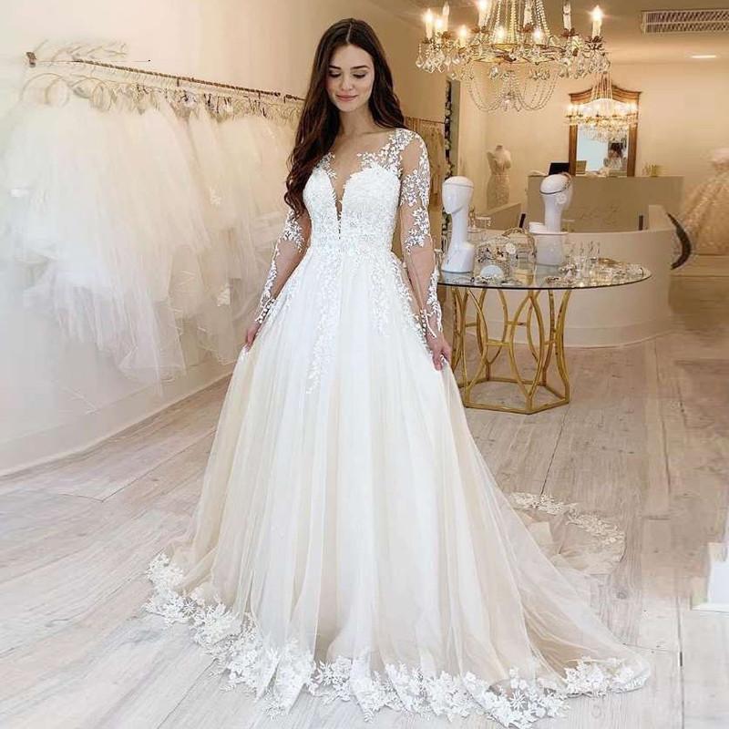 Champagne Lace Wedding Dress A Line Appliqued V Neck Long Sleeves Vintage Bridal Gowns Boho Lady Bride Marriage Dresses