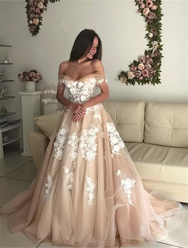 Champagne Wedding Dresses Beach Bridal Gown Sleeveless Off the Shoulder 3D Floral Applique Custom Made Sweep Train