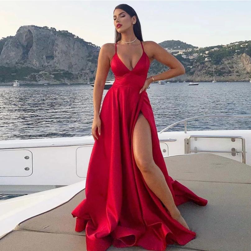 Spaghetti Neck High Side Split Long Prom Dresses Sweep Train Satin Formal Evening Party Gowns