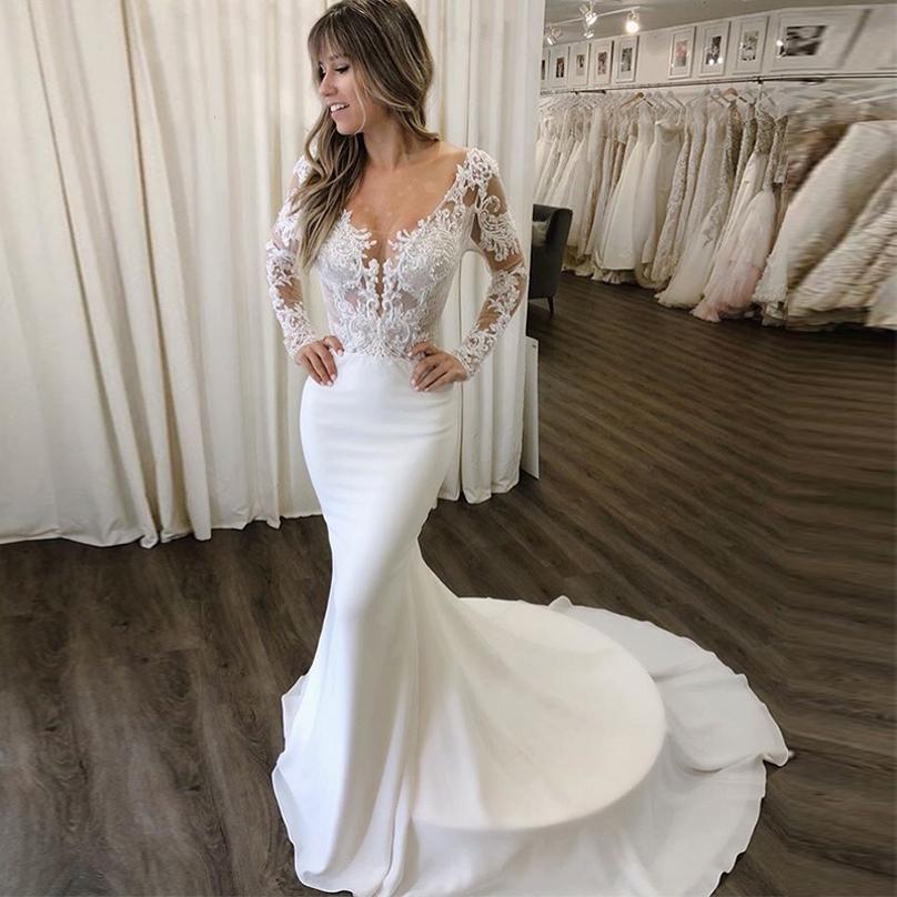 Deep V Neck Lace Mermaid Wedding Dresses with Long Sleeves Sweep Train Appliqeud Lace-up Back Satin Bridal Gowns