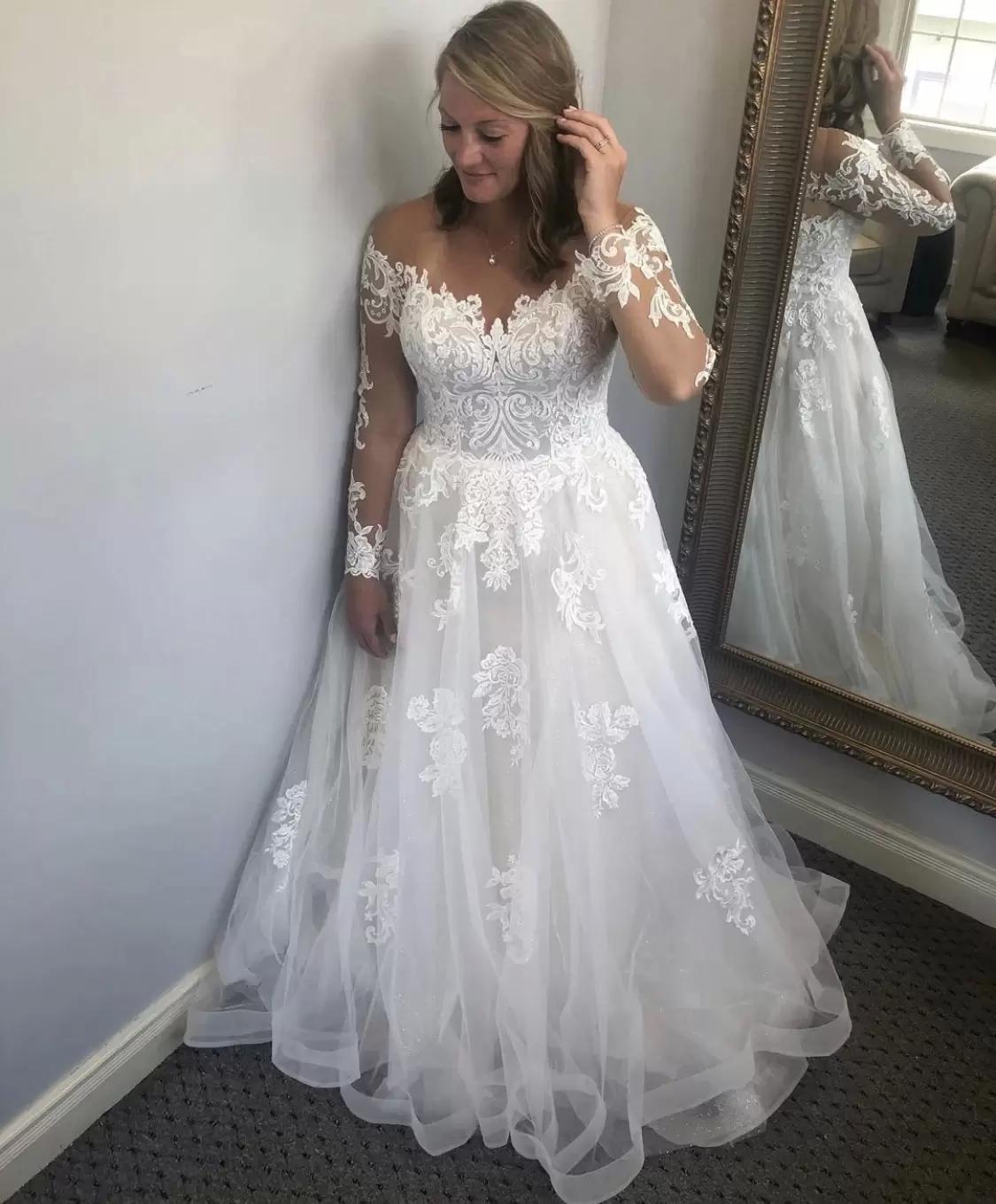 Gorgeous Lace Applique Wedding Dresses Bridal Gown Scoop Sheer Neck Tulle Sweep Train Custom Made Plus Size vestido de novia Designer Long Sleeves