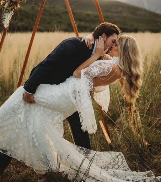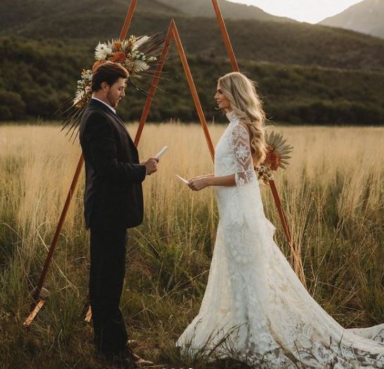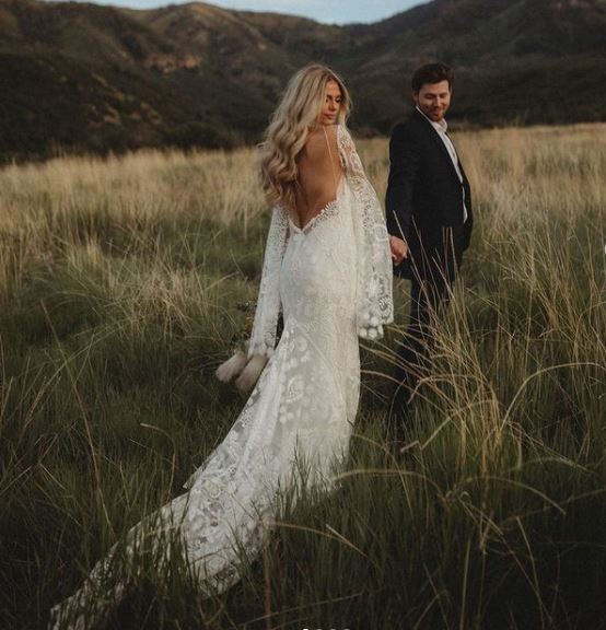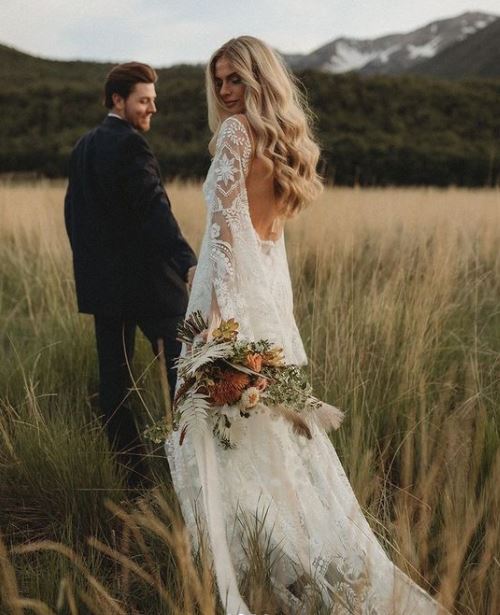 Bohemian wedding dress, simple high neck long sleeve lace open back wedding dress