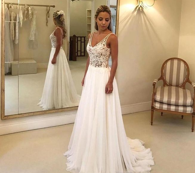 Arabic Plus Size Lace Appliqued V Neck Sleeveless A Line Wedding Dresses With Open Back Custom Made Chiffon Bridal Gowns