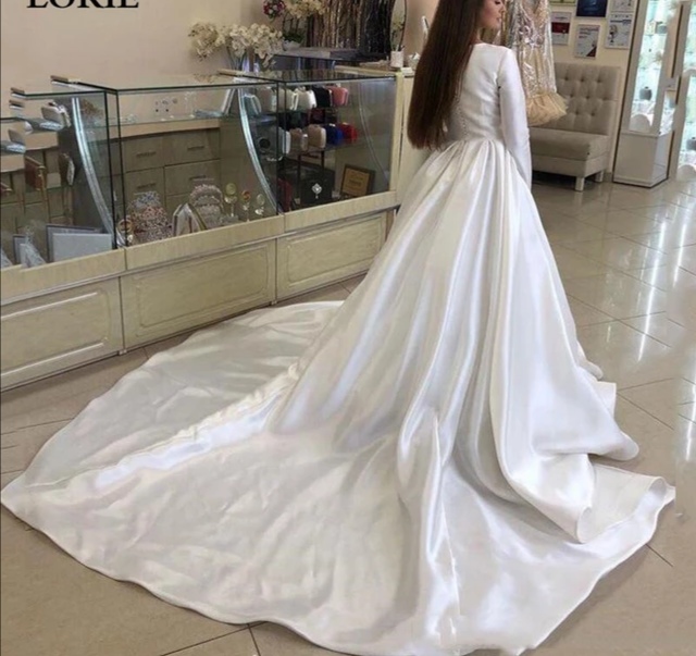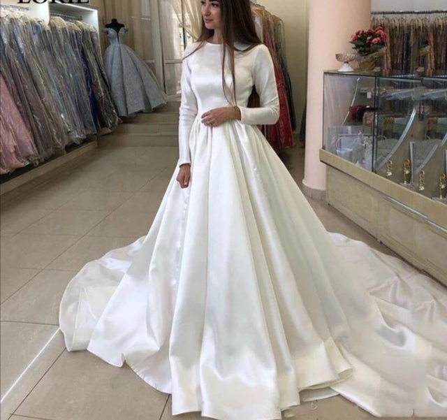 Satin Long Sleeve Muslim Wedding Bride Dresses Long Train White Wedding Gown