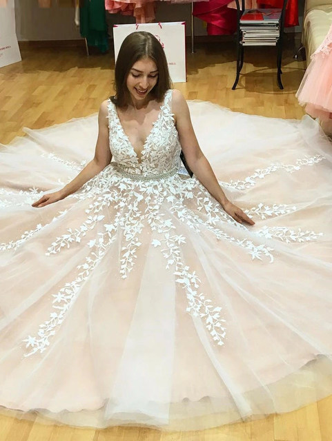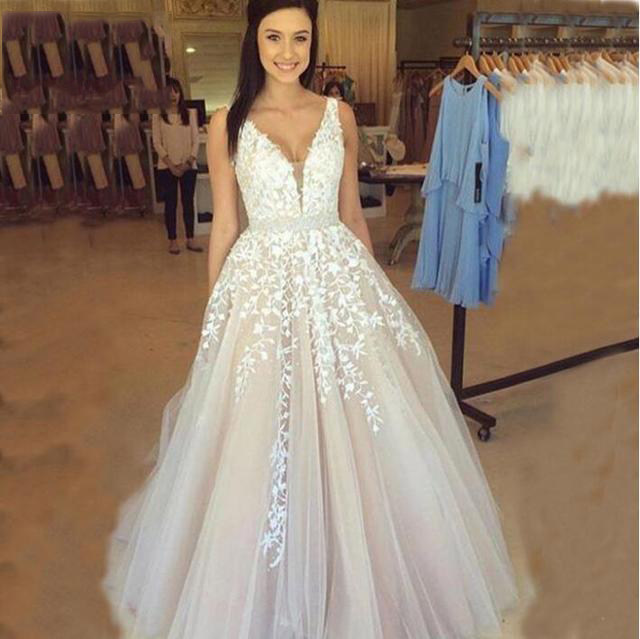 Cheap Lace V Neck Wedding Dresses Light Champagne Floor Length Applique Open Back A Line Backless Bridal Gowns