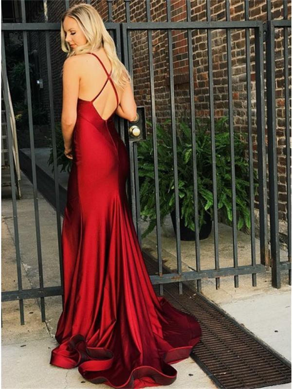 Sexy Spaghetti Straps V Neck Sheath Long Prom Dresses Side Split Sweep Train Backless Party Dress