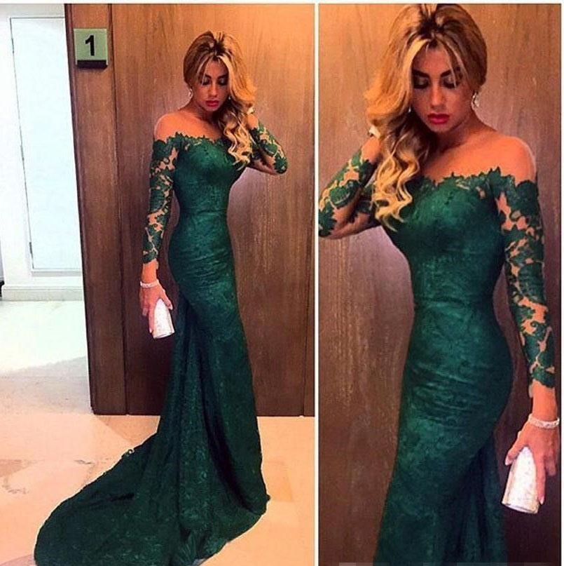 Dark Green Mermaid Lace Evening Dresses Long Sleeve Women Prom Gowns Formal Gowns