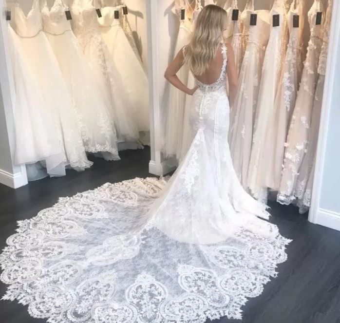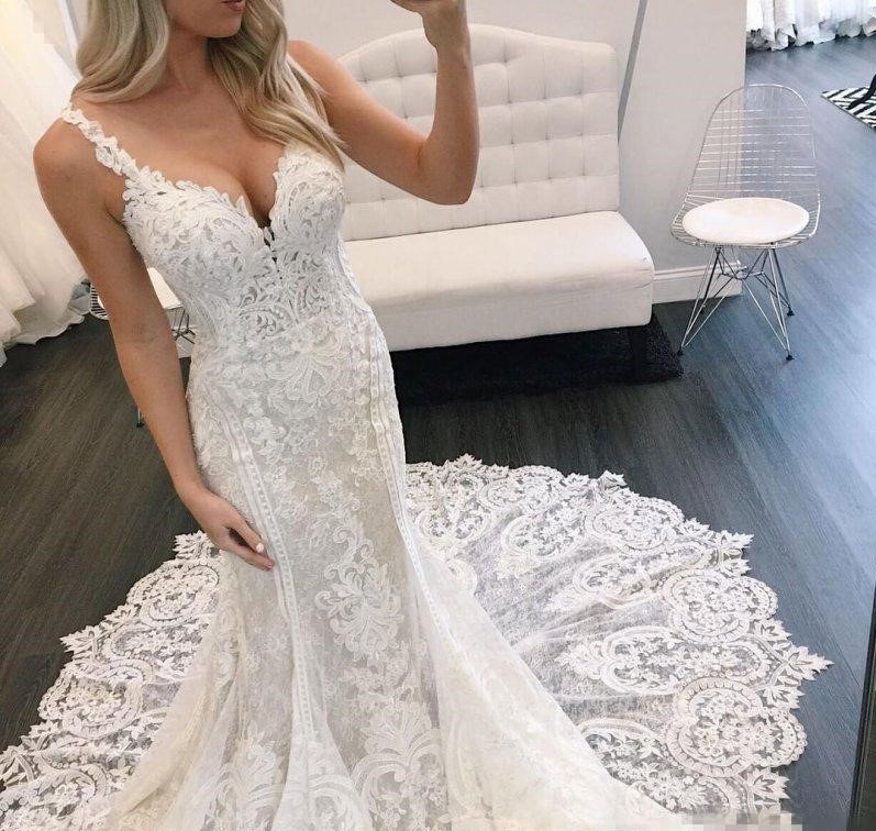 Sexy Backless Mermaid Wedding Dresses Lace Appliqued with Court Train with Spaghetti Straps Chapel Wedding Gown