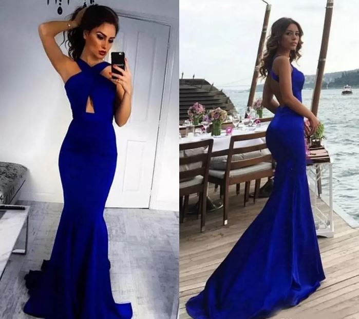 Sexy Royal Blue Mermaid Evening Dresses Backless Satin Simple Keyhole neck Long Prom Dress Sweep Train Party Gowns