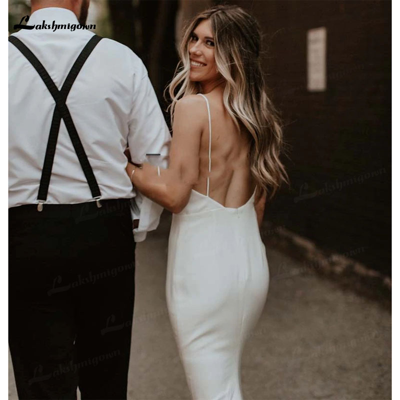 Simple Wedding Dress with Detachable Tulle Skirt Satin V Neck Backless Spaghetti Straps Bridal Gown