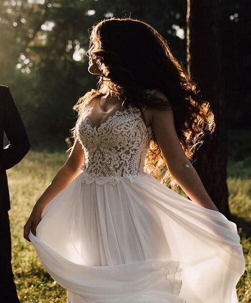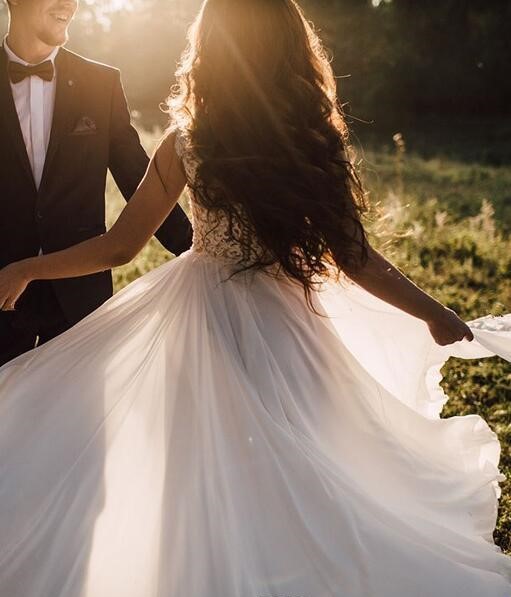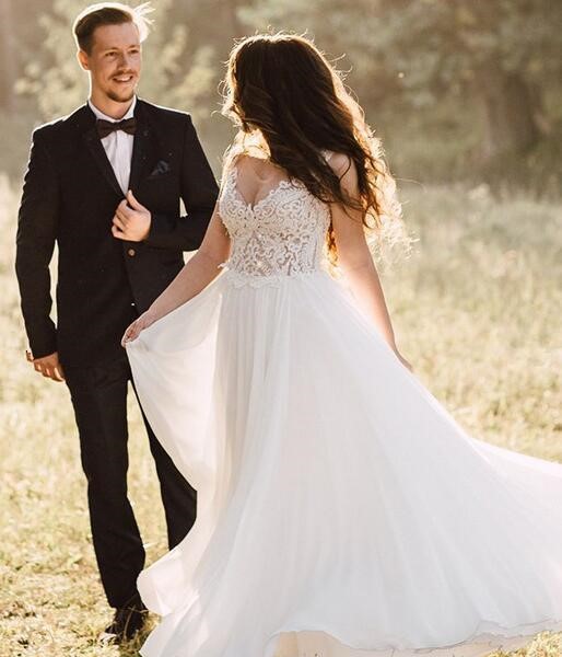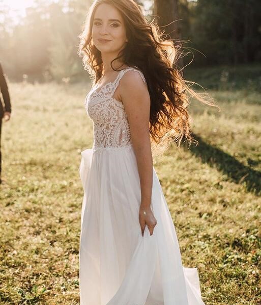 boho A-Line wedding dresses sexy sheer lace neck sweep train chiffon country garden custom made