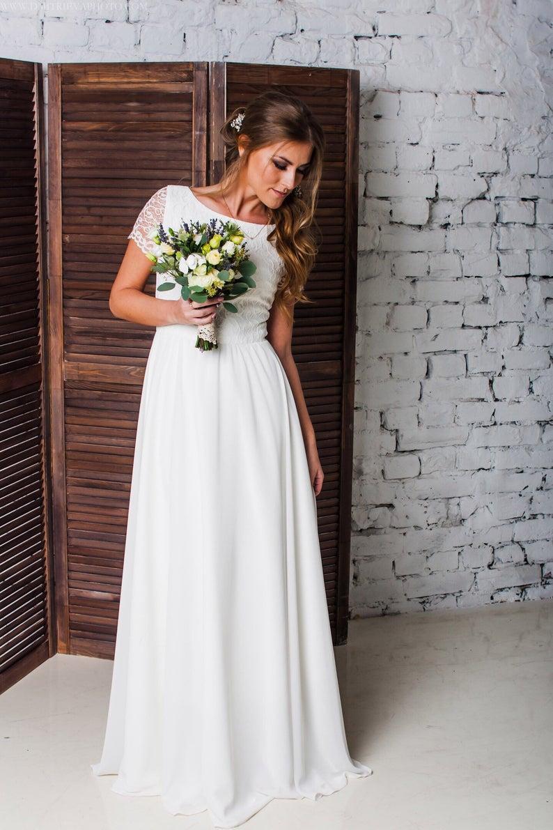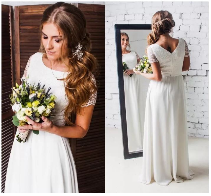 Elegant Chiffon A Line Wedding Dresses Boho Beach Short Sleeve Jewel Neck Lace Bridal Gowns