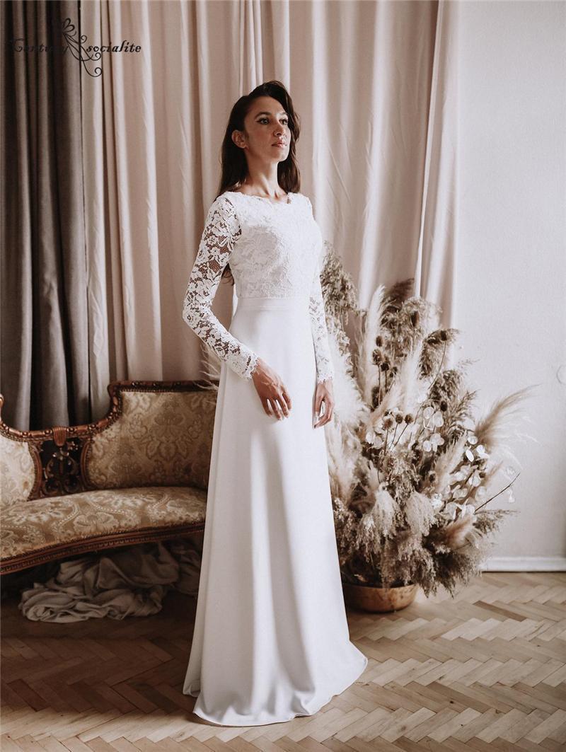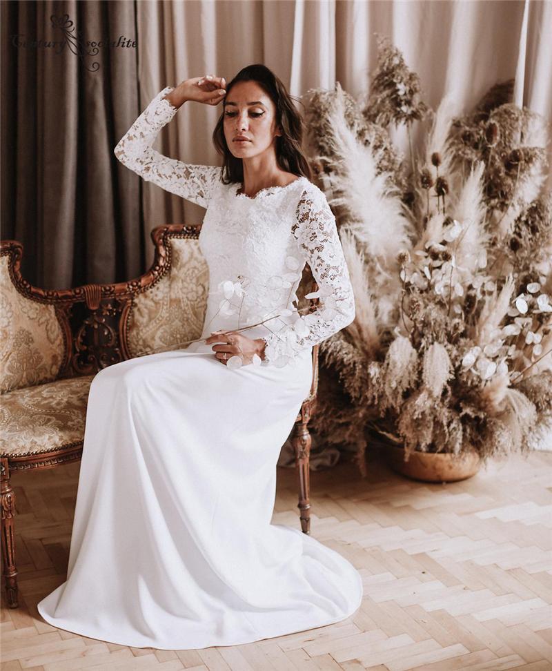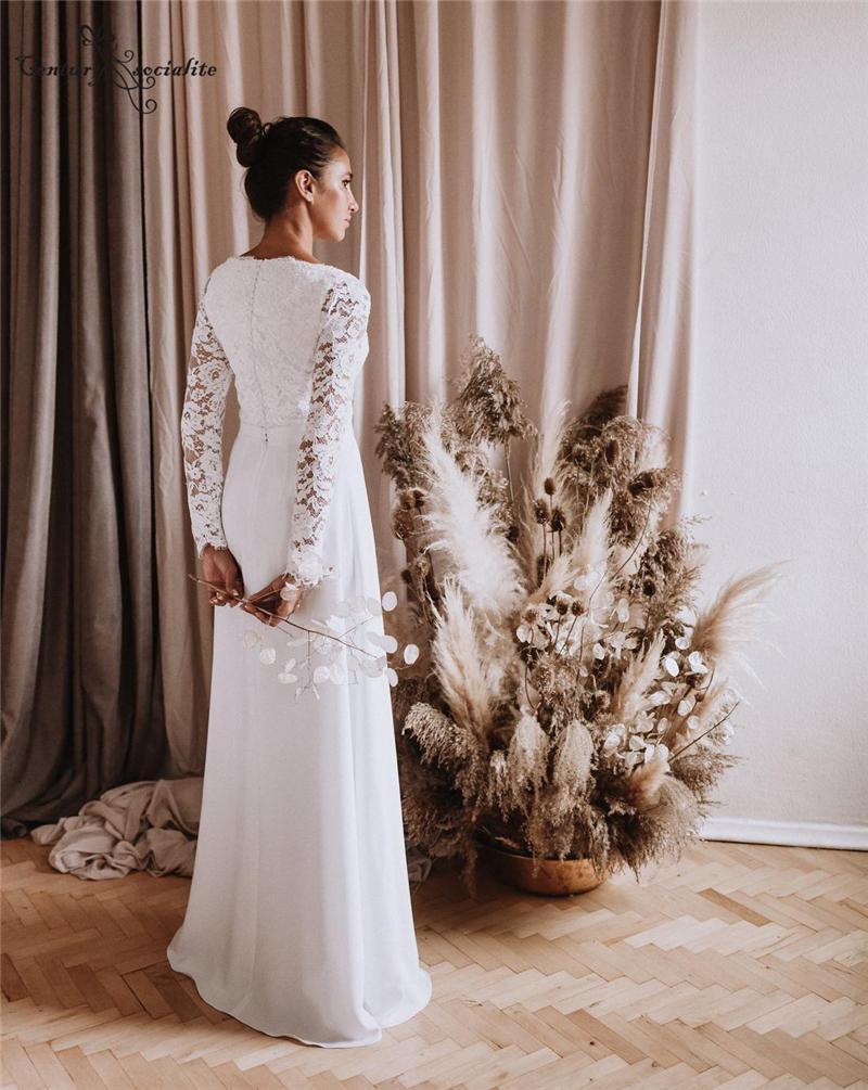 Bohemian Long Sleeves Wedding Dresses Bridal Gown Scalloped Neckline Chiffon Lace Applique Floor Length Custom Made Party Gowns