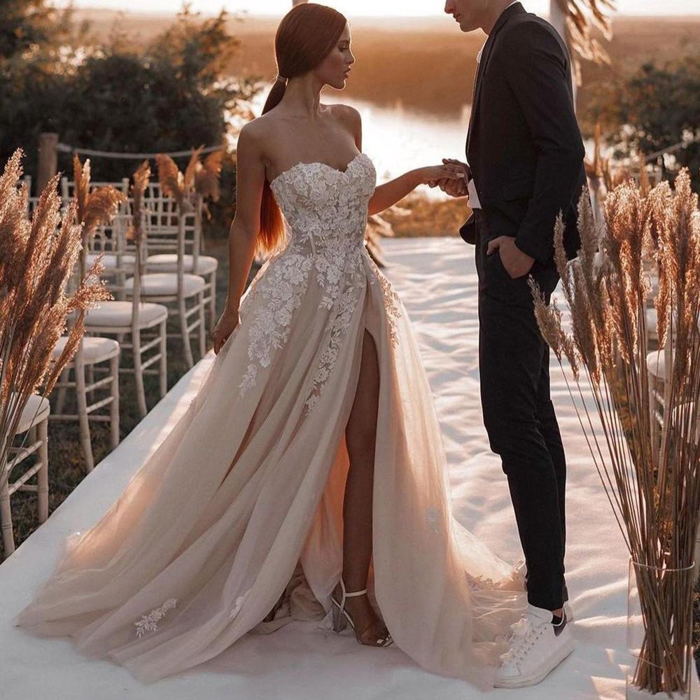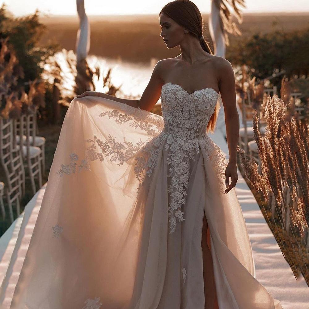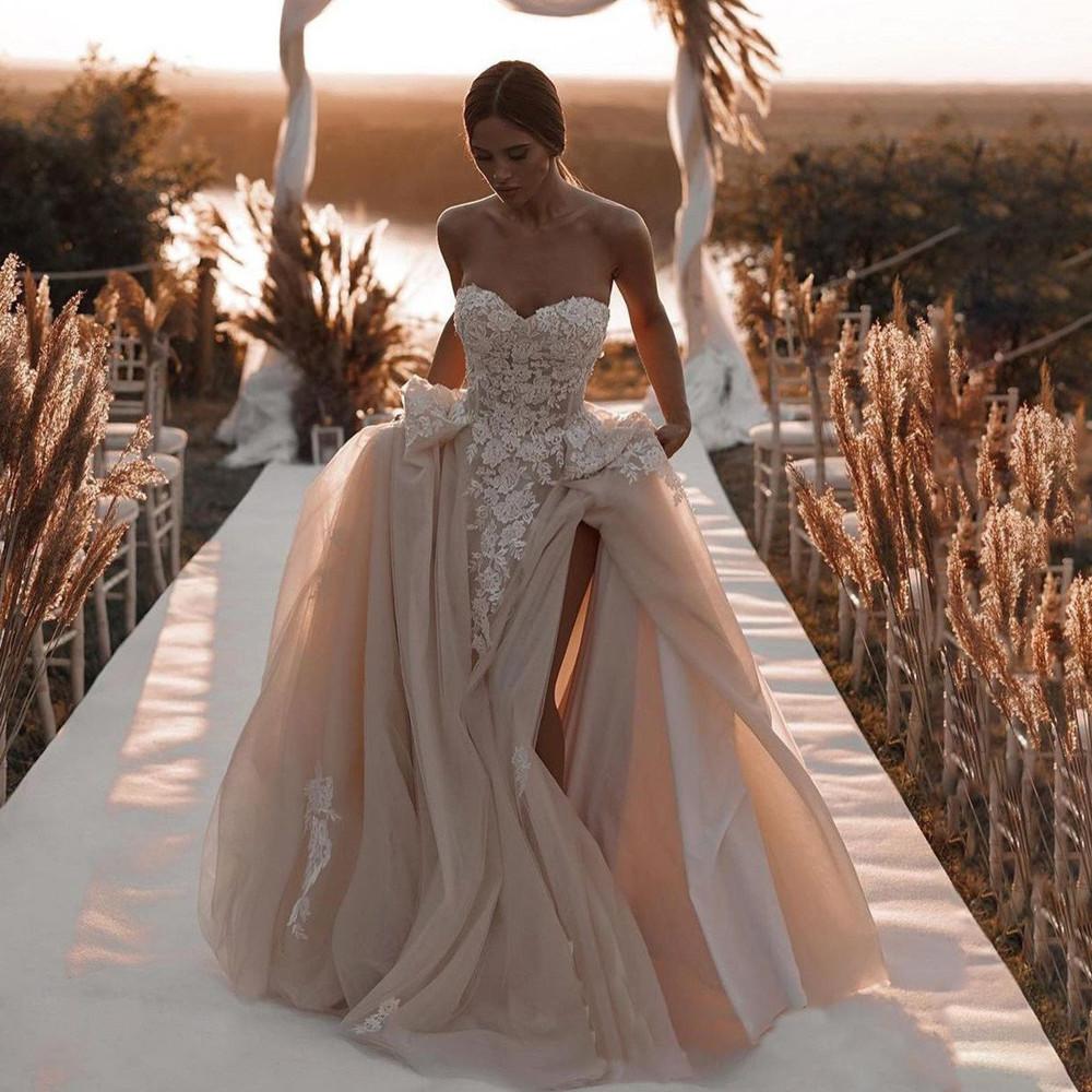 Champagne Sweetheart Floral Appliques Bridal Gown Luxury High Split Tulle Corset Long Train Lace Boning Wedding Dress