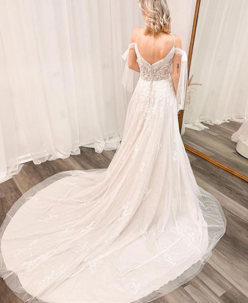 Bohemian Spaghetti Straps Princess Wedding Dresses V-neck Lace Boho Bride Dresses Side Split Wedding Gowns
