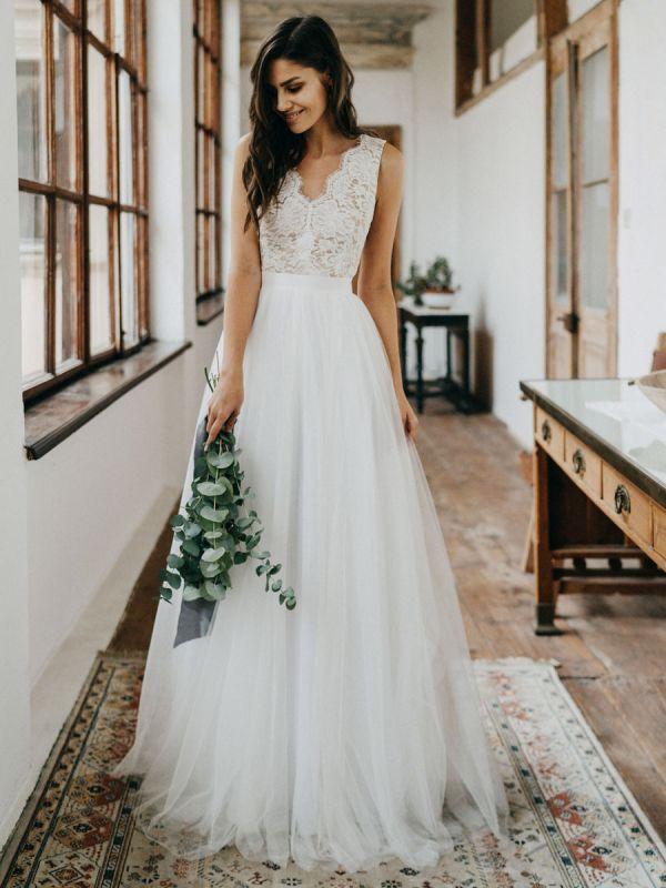 Bohemian A-line V Neck Lace Wedding Dresses Backless Floor Length Sleeveless Tulle Bridal Gowns