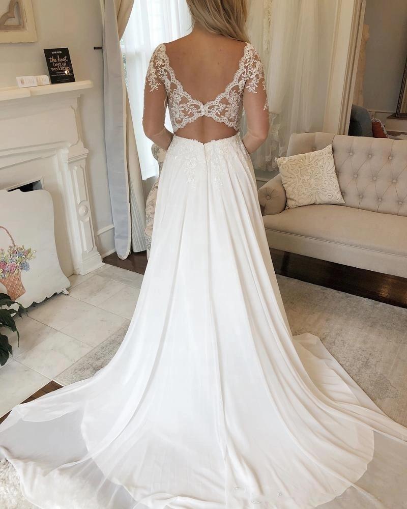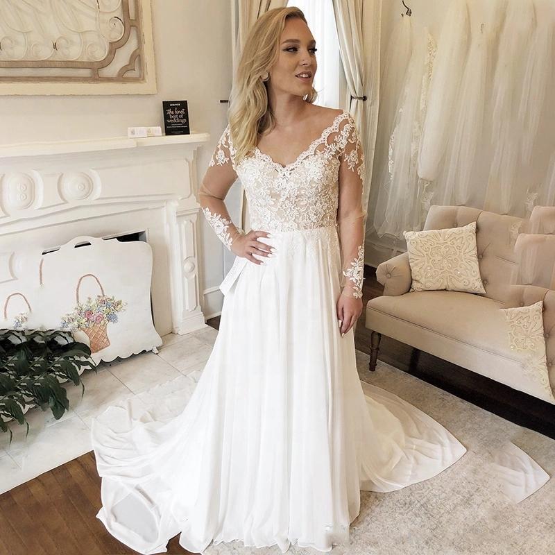Bohemian Chiffon A Line Wedding Dresses V Neck Lace Appliques Long Sleeve Bridal Gowns