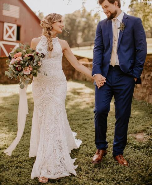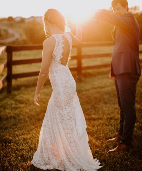Boho Lace Mermaid Wedding Dresses Jewel Neck Hollow Back Sleeveless Sweep Train Appliqued Country Wedding Dress