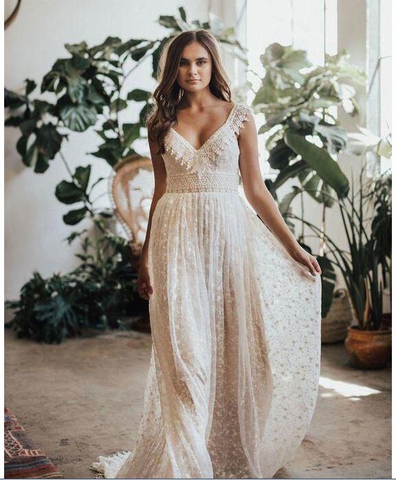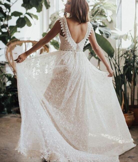 Elegant Wedding Dresses Full Lace V-Neck Sleeveless Floor length A Line V-Back Bridal Giwns