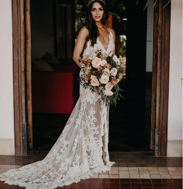 Boho Beach Wedding Dresses Spaghetti Straps Delicate Lace Side Slit Champagne Lining Bridal Gowns