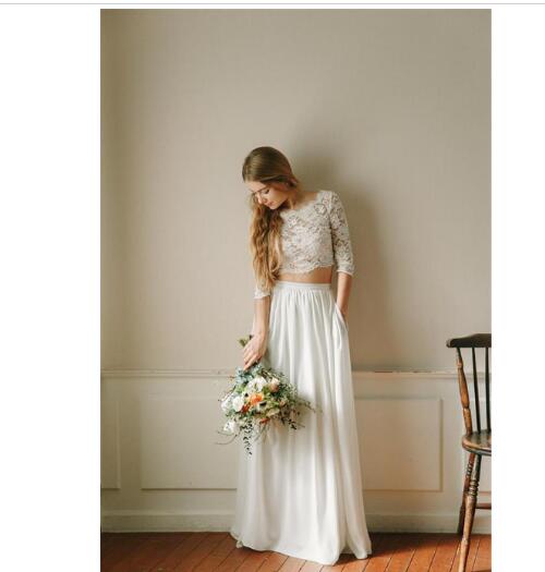 Boho Draped Floor Length Bridal Gowns Simple Plus Size 3/4 Long Sleeve Chiffon Lace Appliques Two Pieces Wedding dress