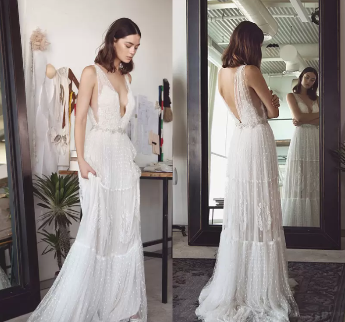 Bohemian Lace Wedding Dresses Deep V Neck A Line Backless Beach Wedding Dress Sweep Train Tulle Boho Bridal Gowns