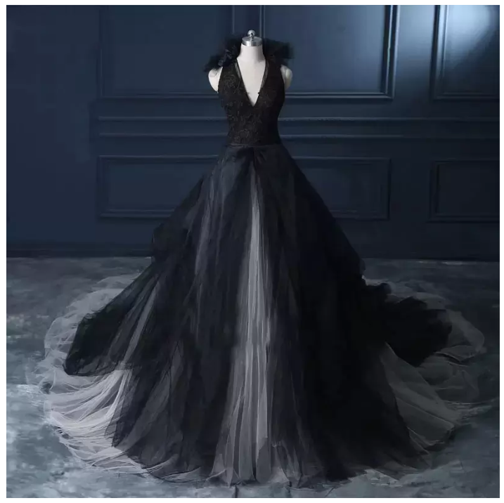 Vintage Black and White Wedding Dress V neck Gothic Sleeveless Lace Appliques Ruffles Tulle Victorian Bridal Gowns