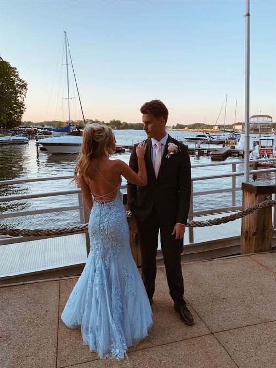 Beautiful Mermaid Scoop Neck Cross Back Sky Blue Tulle Lace Prom Evening Dress