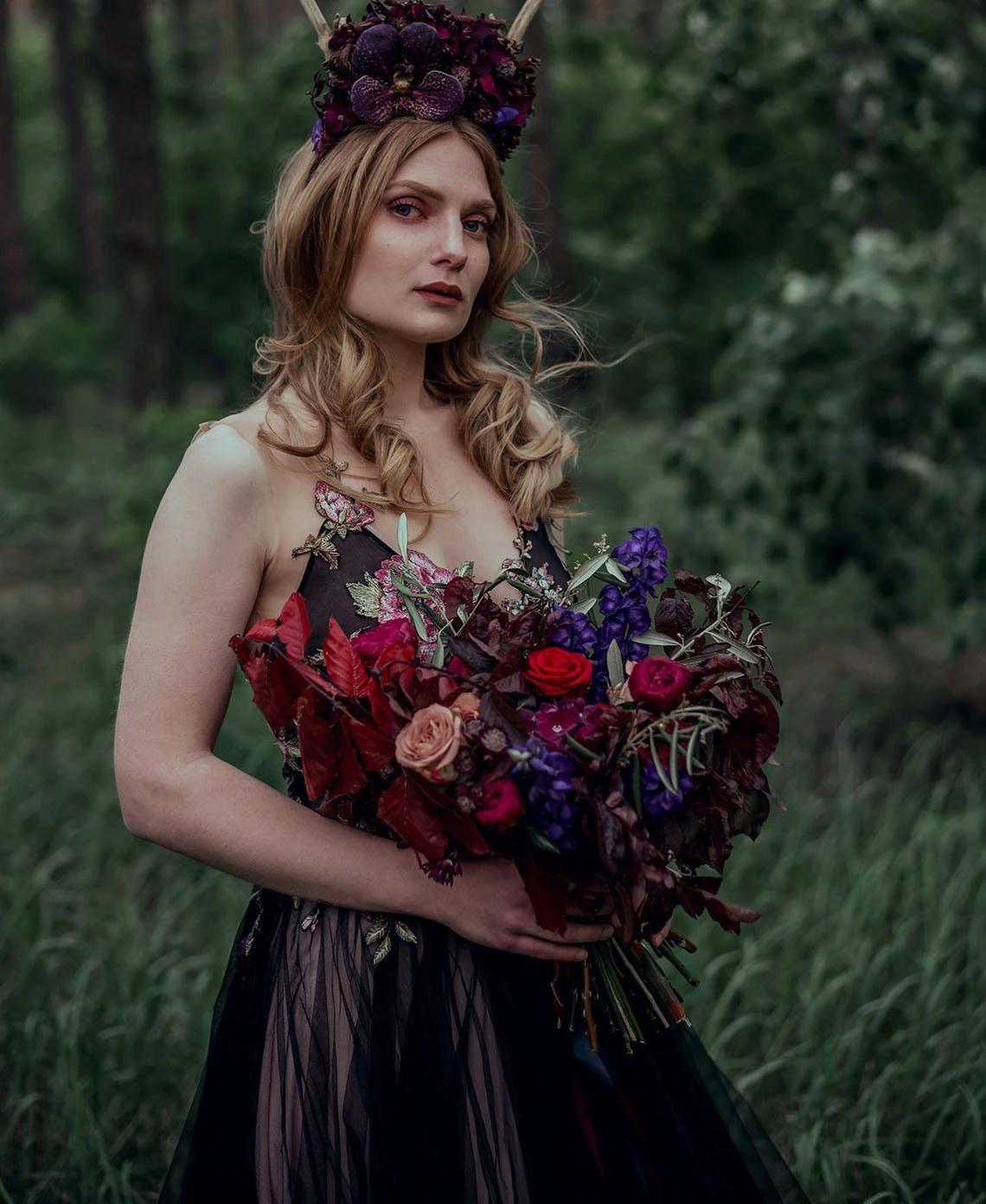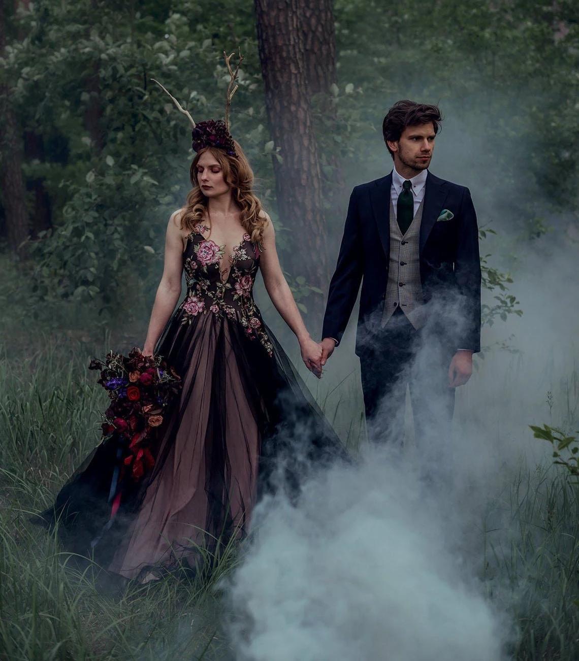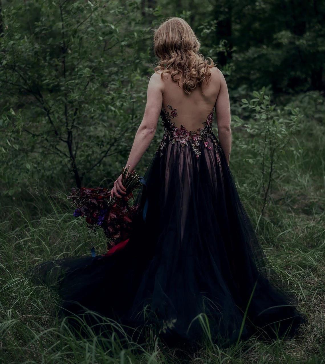 Gothic Black Floral Wedding Gowns Lace Embroidery Tulle A Line Vintage Country Bridal Dress