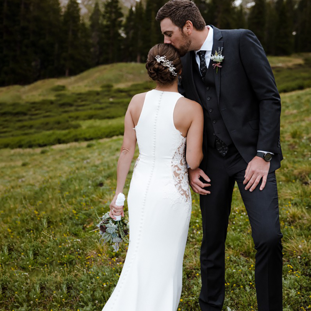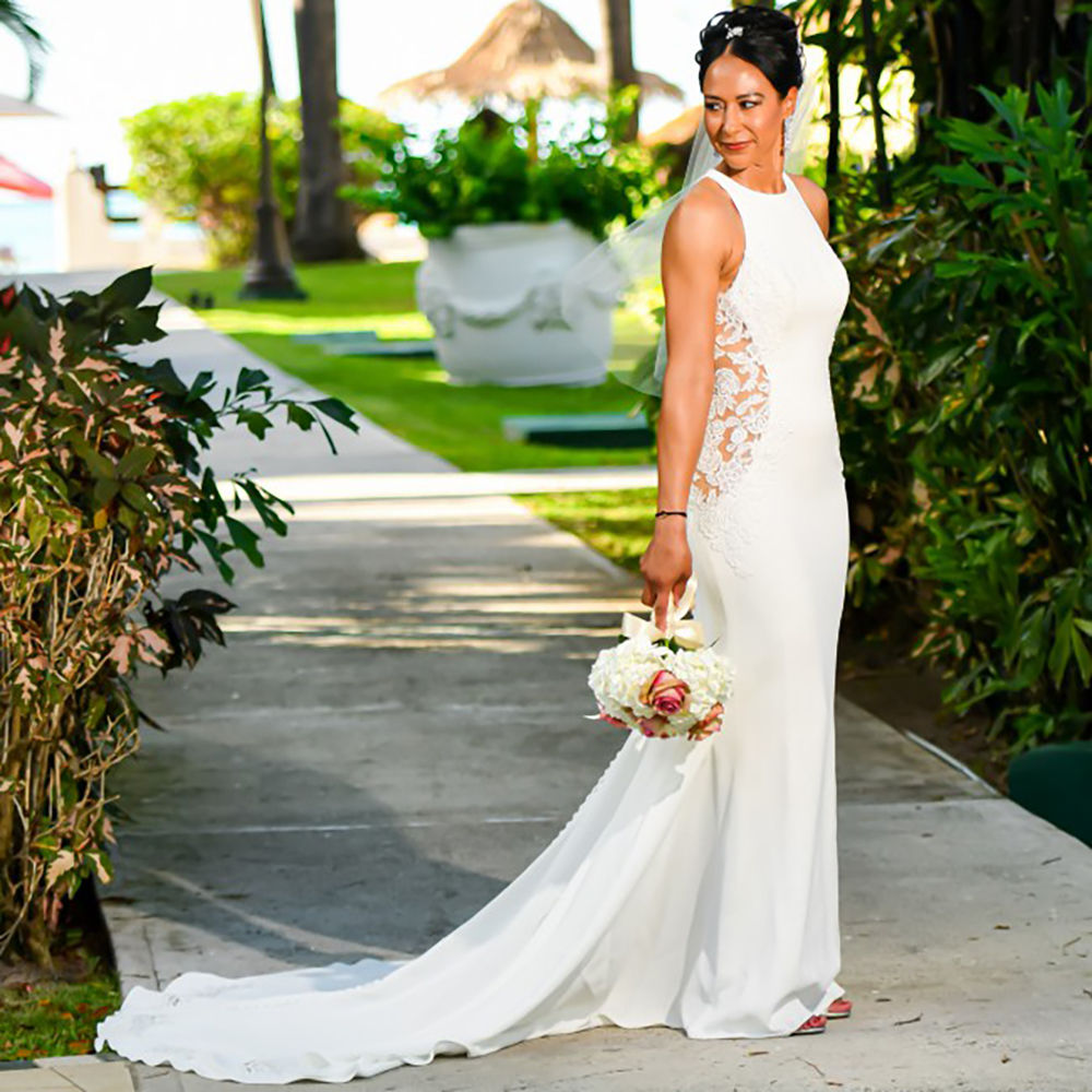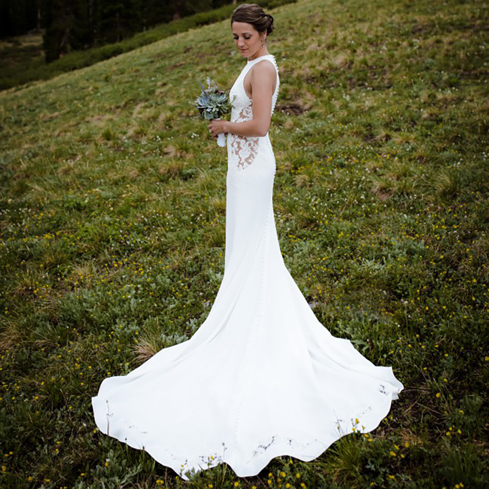 Crepe Fit and Flare Simple Wedding Dress Illusion Lace Cutouts Custom Made Buttons Crew Neck Mermaid Appliques Bridal Gowns