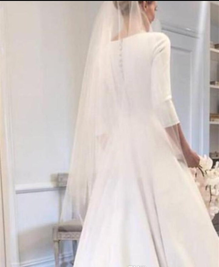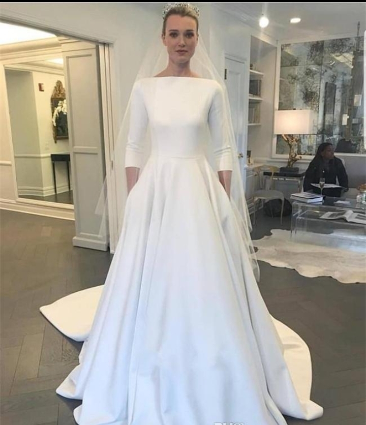 Modest Satin A Line Wedding Dresses Meghan Markle Style Bateau Neck Long Sleeves Garden Bridal Gowns