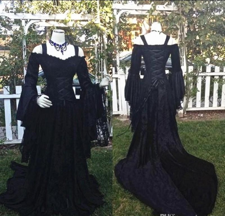 Gothic Style Sleeping Beauty Black Wedding Dresses Off Shoulder Long Puffy Sleeves Lace Corset Bodice Wedding Bridal Gowns