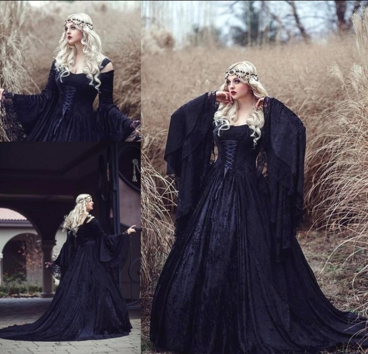 Vintage Gothic Hallowen Lace Princess Wedding Dresses Plus Size Off Shoulder Long Sleeve Castle Chapel Train Bridal Wedding Gown