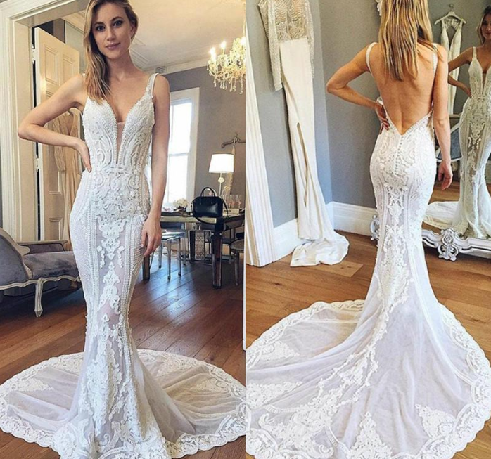 Couture Wedding Dresses V Neck Sweep Train Lace Appliqued Sexy Backless Beach Wedding Dress