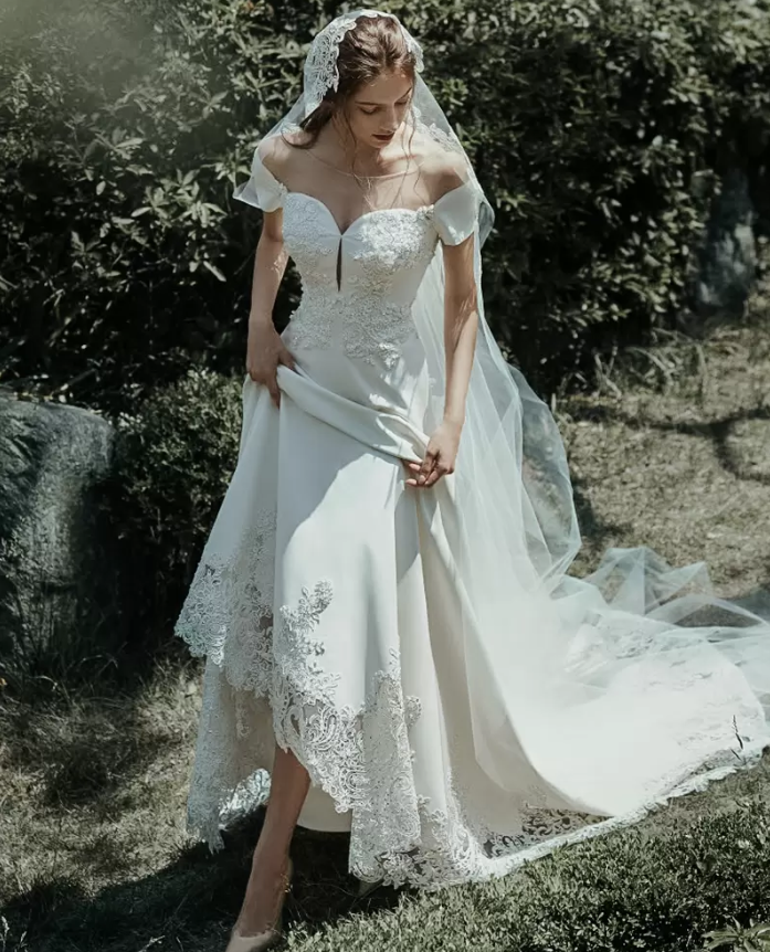 Enchanted Vintage A Line Wedding Dress Court Train Short Sleeve Lace Appliques Garden Romance Ethereal Bridal Dresses