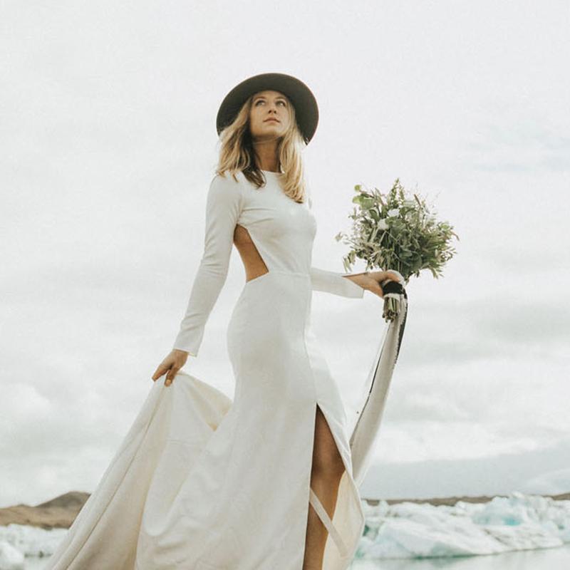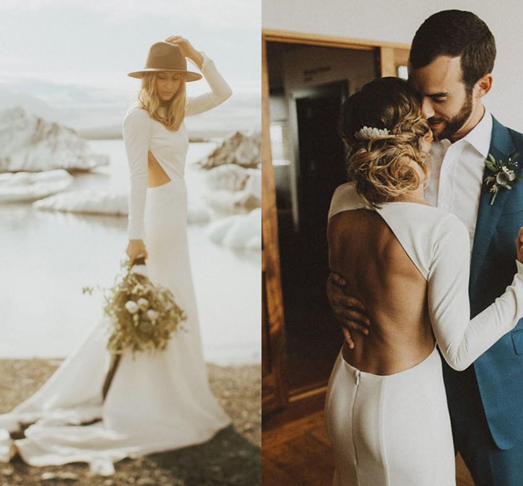 Simple Crepe Beach Wedding Dresses Long Sleeve Backless Jewel Neck Soft Stain Bohemian Mermaid Bridal Gowns