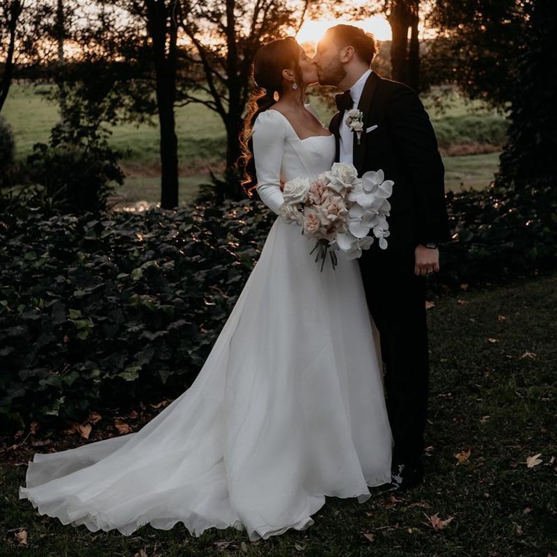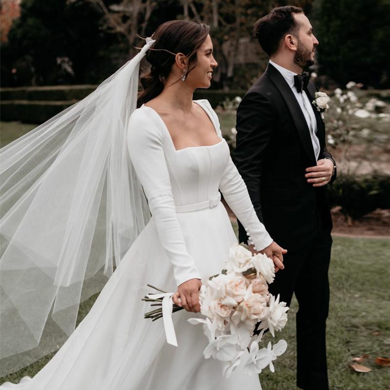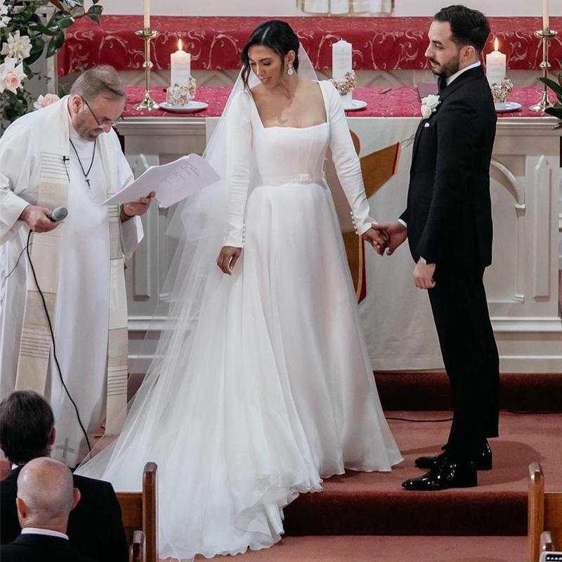 Sqaure Collar A Line Wedding Dresses Organza Country Bridal Gown with Belt Long Sleeve