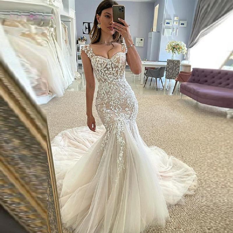 Wide Strap Mermaid Wedding Dress Sweetheart Lace Appliques Bridal Gowns Cap Sleeve Tiere Bottom Marriage Dresses