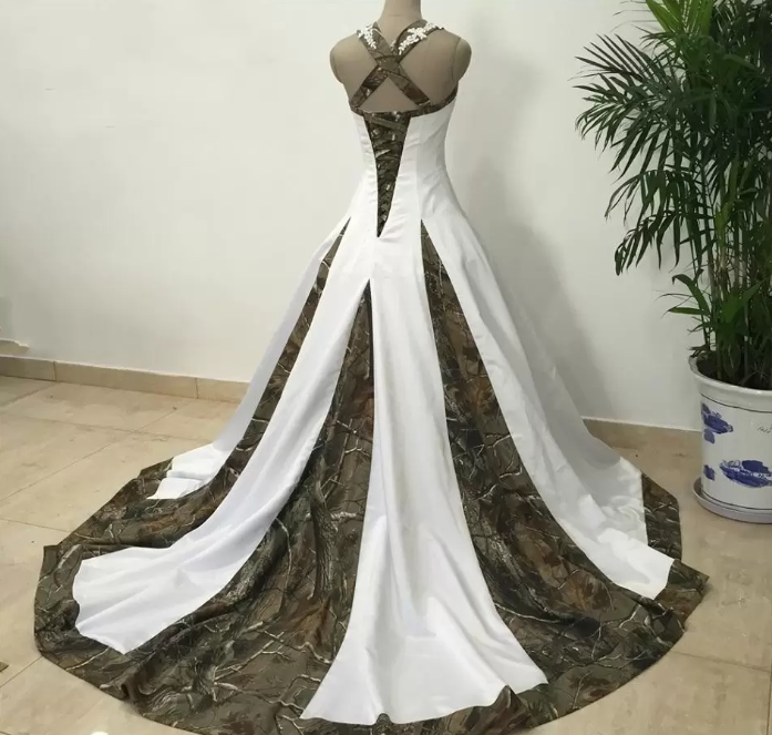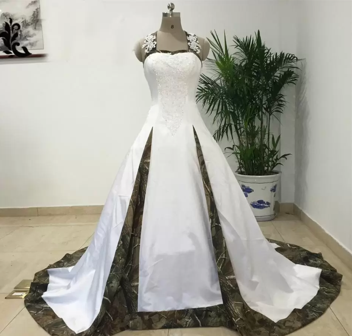 A Line Camo Wedding Dresses Lace Applique Beading Ball Gown Sweep Train Bridal Gowns