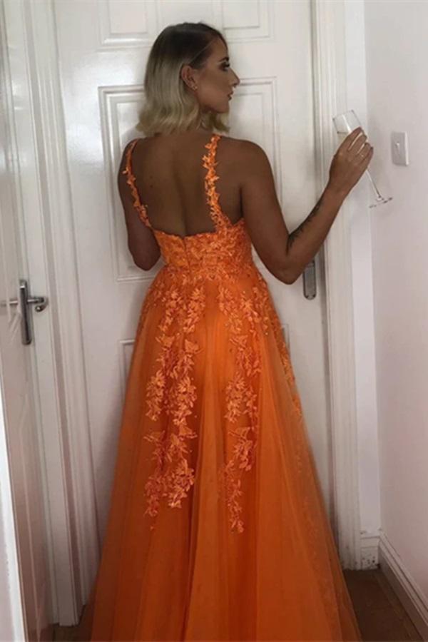 A-Line Orange Lace Appliques Tulle Prom Dresses Spaghetti V Neck Backless Sweep Train Formal Party Gowns