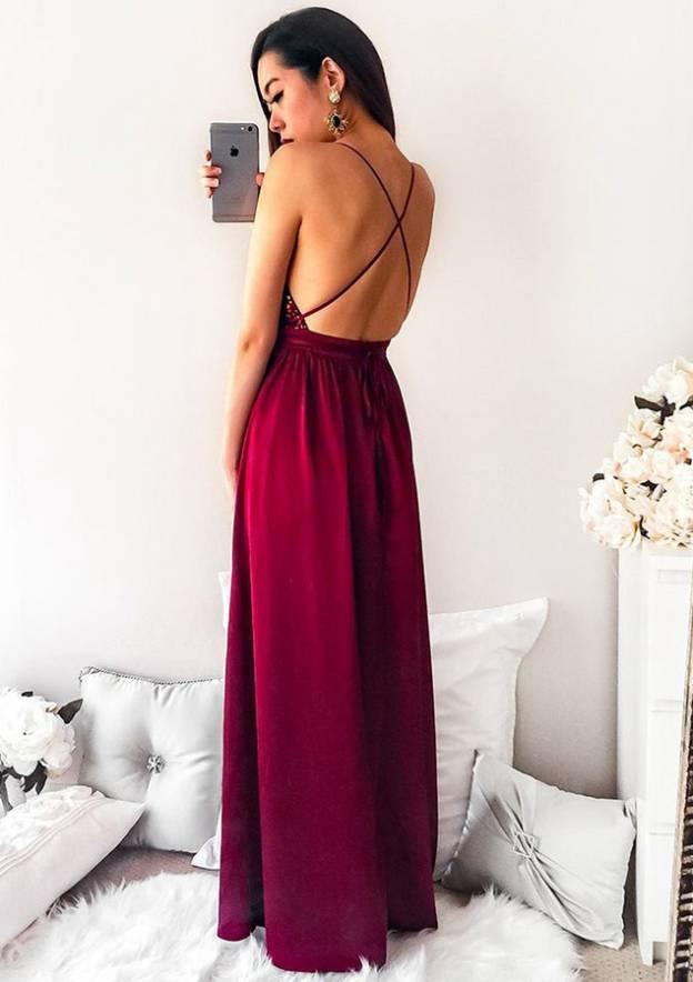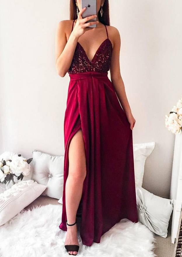 A-line Spaghetti V Neck Sequins Prom Dresses Chiffon Side Split Backless Floor Length Party Gowns