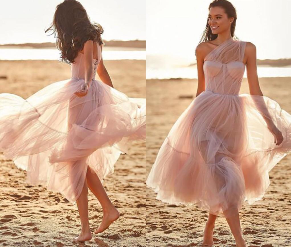 Dusty Blue Sexy One Shoulder Prom Dress Tea Length A Line Elegant Lady Corset Formal Party Gowns