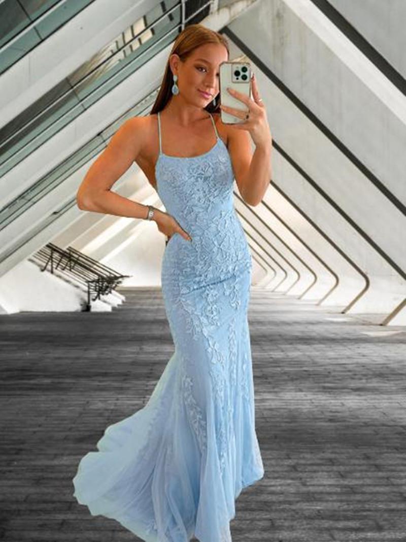 Mermaid Applique Prom Dress Backless Sexy O Neck Spaghetti Straps Evening Dress