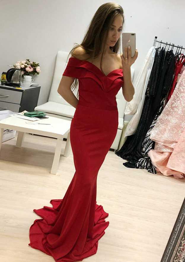 Off-the-Shoulder Short Sleeves Sweep Train Charmeuse Prom Dresses