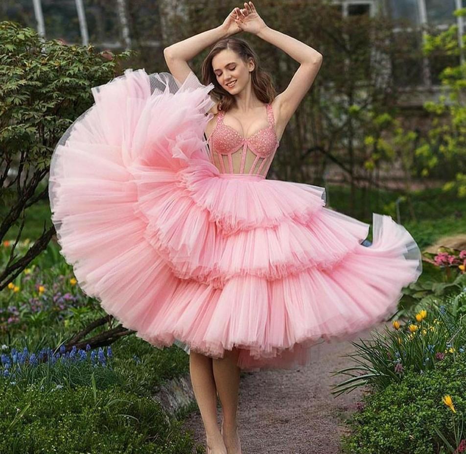 Pink Sweetheart Short Prom Dress Ball Gowns Straps Beaded Crystal Tiered Knee Length Brithday Party Gown