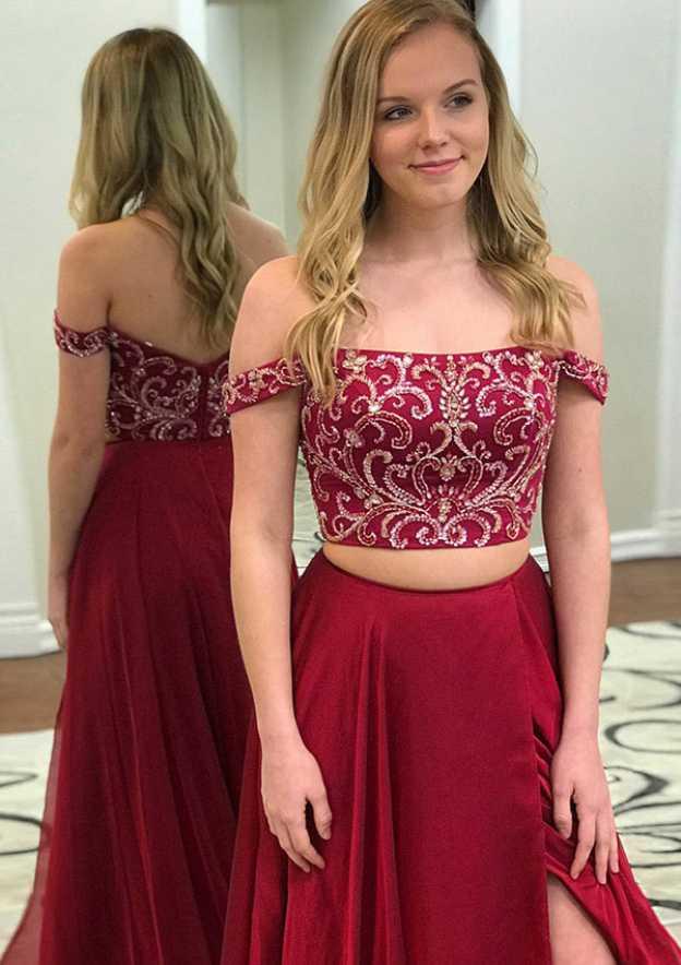 Red Chiffon Two Pieces Prom Dresses A-Line Off The Shoulder Beads Sequins Side Split Party Gowns