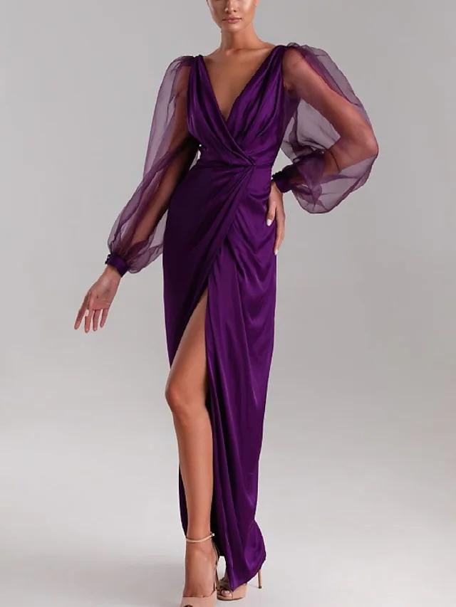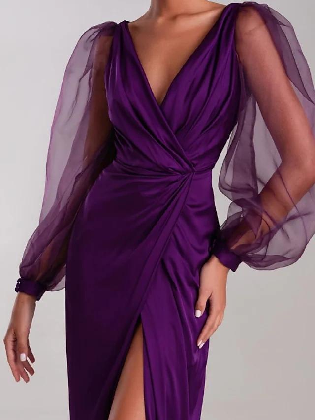 Sexy Mermaid Grape Prom Formal Evening Dress V Neck Long Sleeve Floor Length Pleats Slit Party Gown